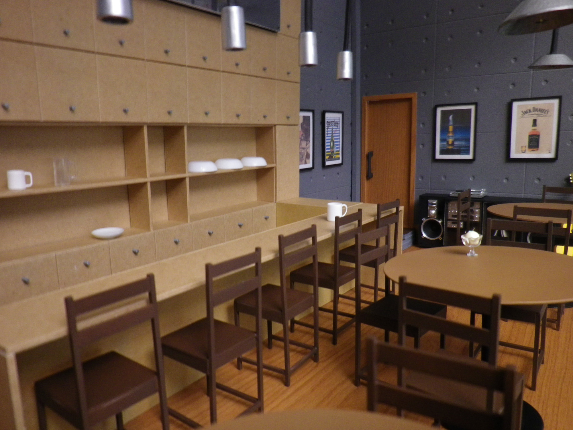 素材はスチレンボードとガムテープとプラ板とプラ棒。店のロゴは印刷して透明プラ板で挟み、角に虫ピンを挿して固定しています。棚の扉は形だけなので開きません。