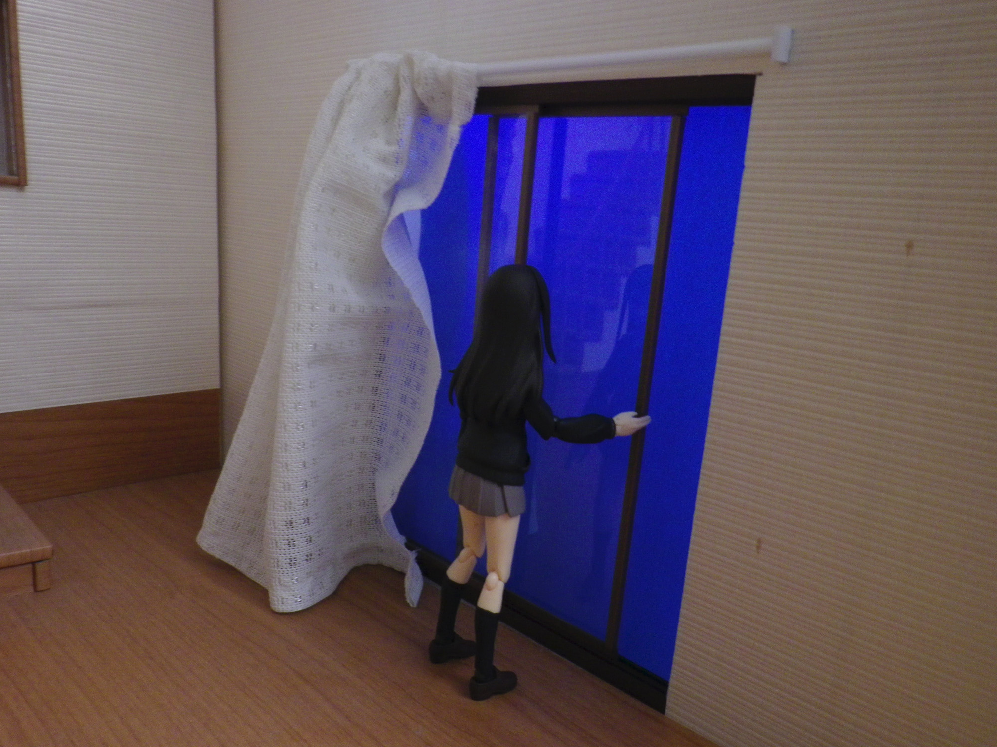 窓は一応開きます。外のブルーの背景は演出のため印刷した物です。